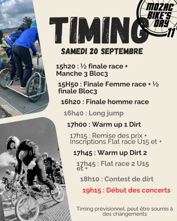 le contest de dirt et la Flat Race pour les U15 et plus. Tout au long de la journée, concours surprises, village et animations pour lancer la soirée de